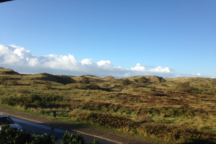 Überdachter Süd-West-Balkon mit Blick auf die Dünen und Gartenmöbeln:
